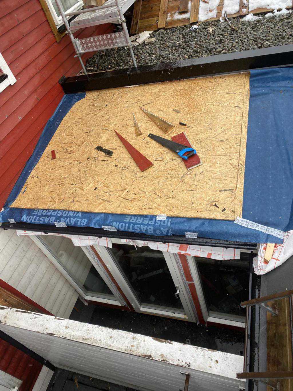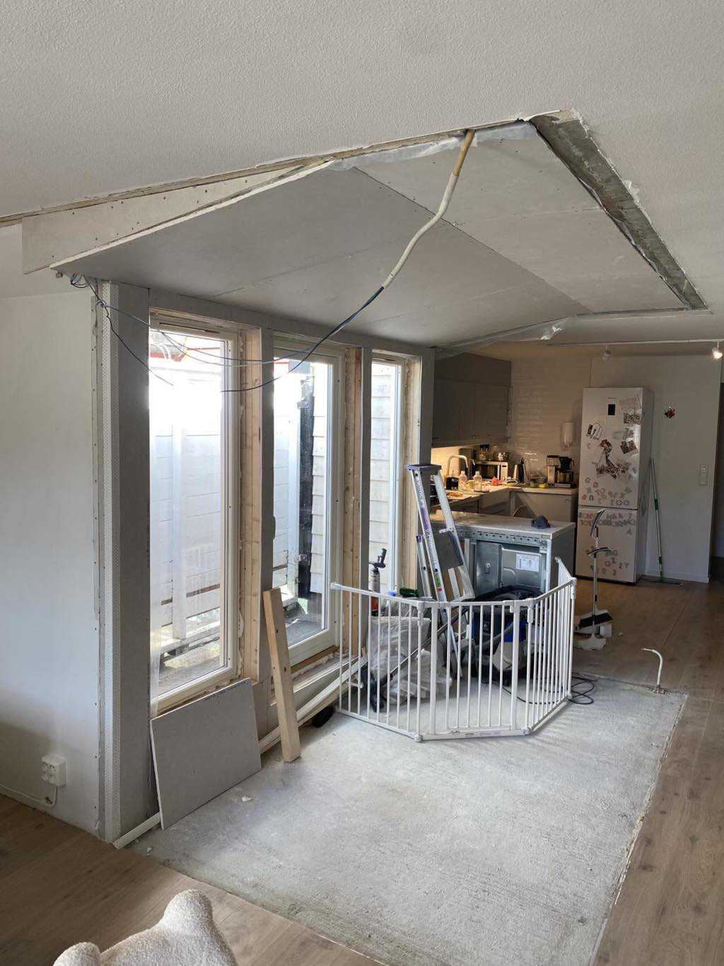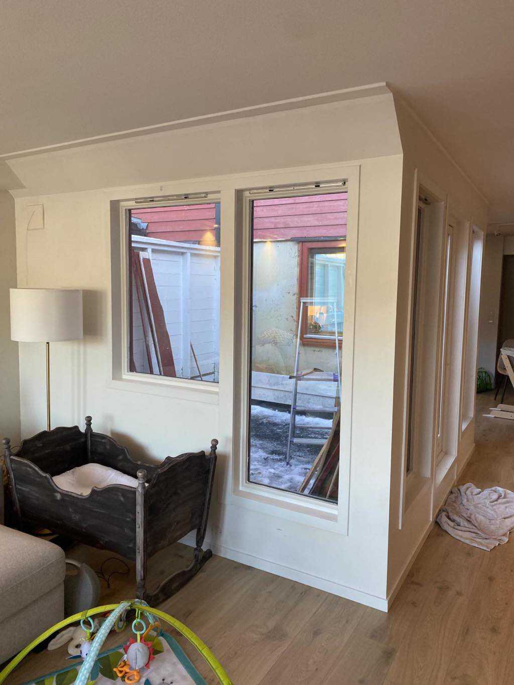 For å få større plass i stuen ble det her ofret litt uteplass, vi har bygget nytt takk og ny vegg som er tekket med sarnafil for tetthet før vi rev innerveggene og gipset innvendig. Dette resulterte i en mye mere anvendelig stue med bedre plass til barna. Vi har også byttet vinduene og døren samt kledning som var dårlig.
