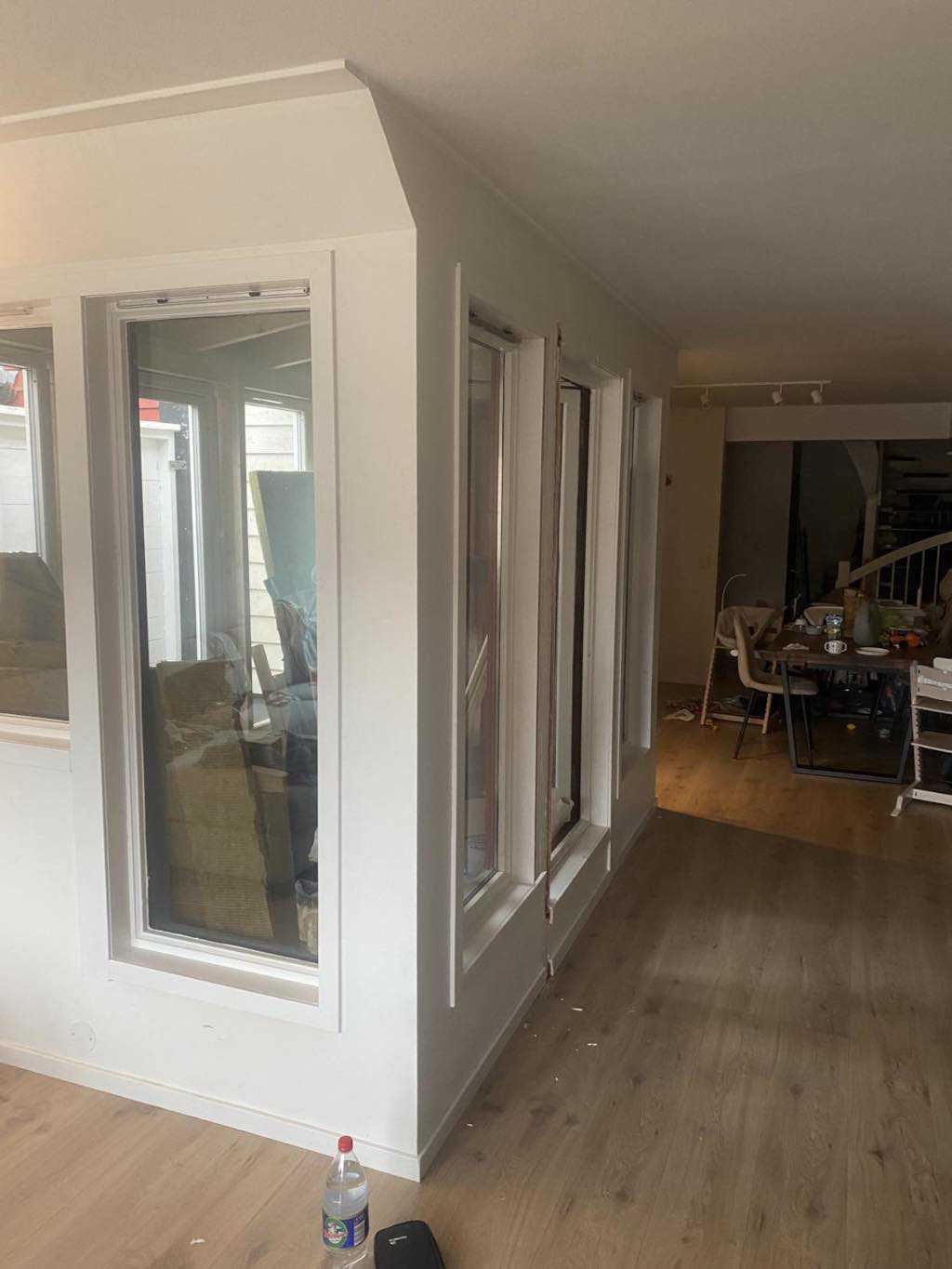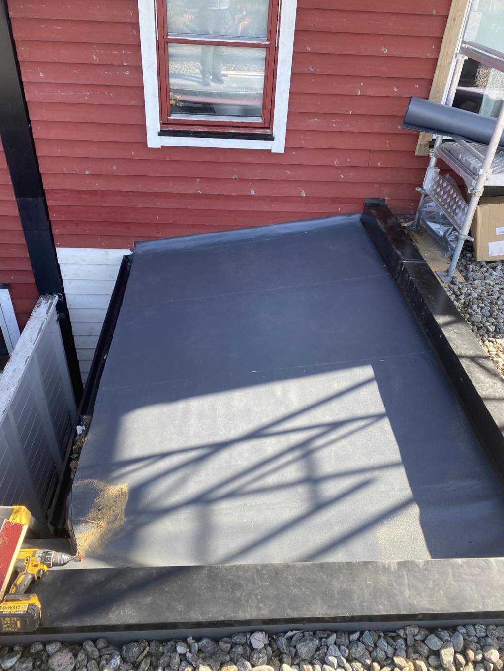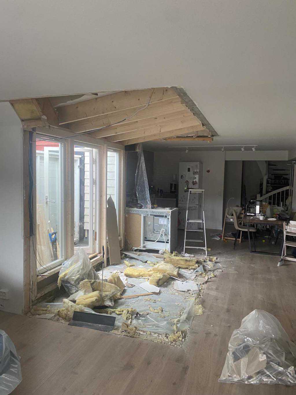 For å få større plass i stuen ble det her ofret litt uteplass, vi har bygget nytt takk og ny vegg som er tekket med sarnafil for tetthet før vi rev innerveggene og gipset innvendig. Dette resulterte i en mye mere anvendelig stue med bedre plass til barna. Vi har også byttet vinduene og døren samt kledning som var dårlig.
